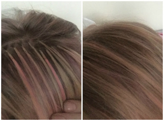 I've exposed the bonds in the first photo to show you what they look like, while the second one is my own hair back in place over the bonds.